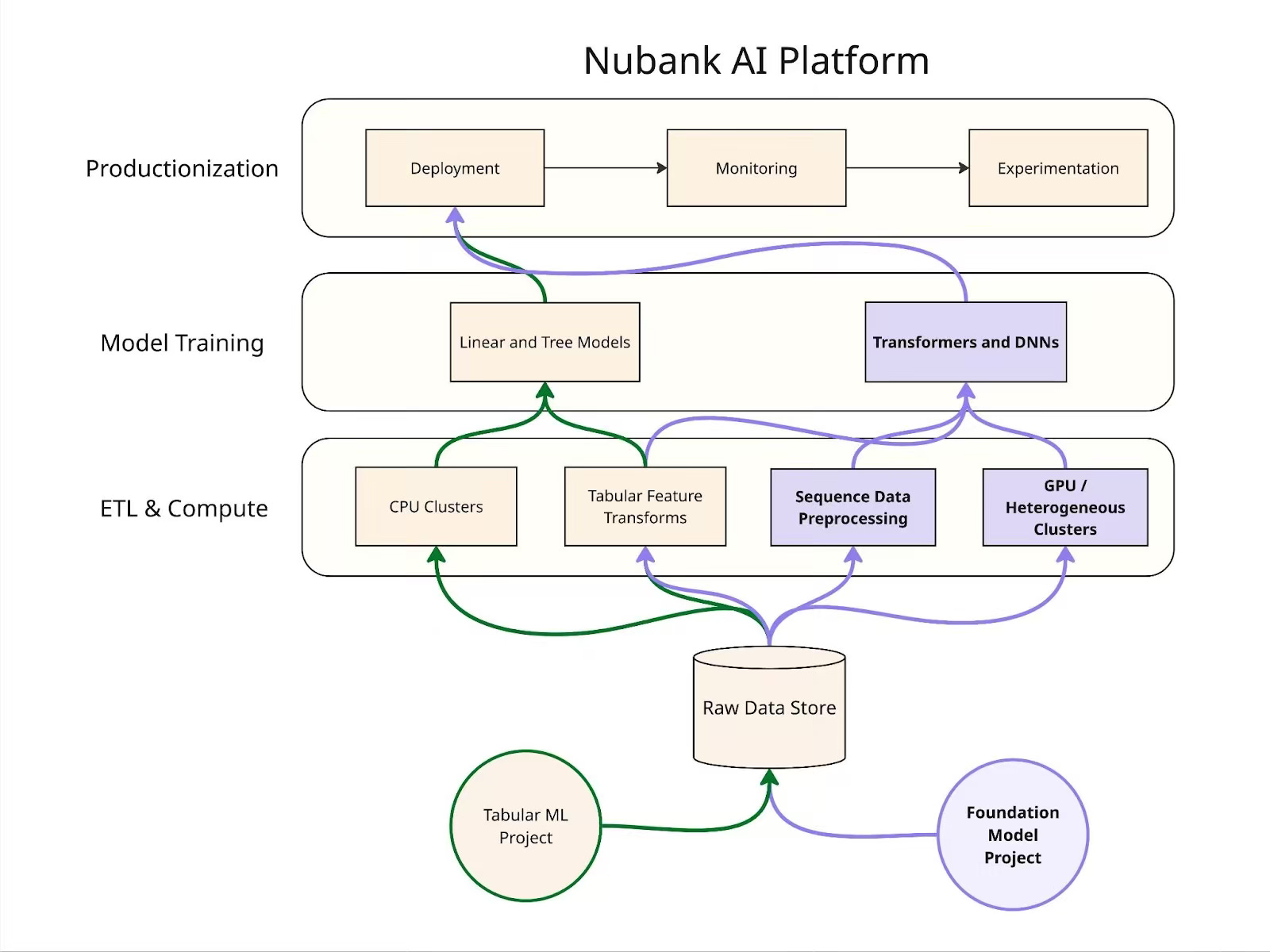 Nubank shares its integrations of Foundation Models—mainly transformers—into its AI platform to go beyond traditional tabular ML. Building on existing data infrastructure and governance, Nubank added components for sequence data preprocessing, GPU cluster orchestration (via Ray), and deep model training. The new stack boosts AUC by >1.2% on benchmarks without new data. It is now powering key use cases, all backed by tooling for model tracking, cataloging, and impact measurement against tabular baselines.