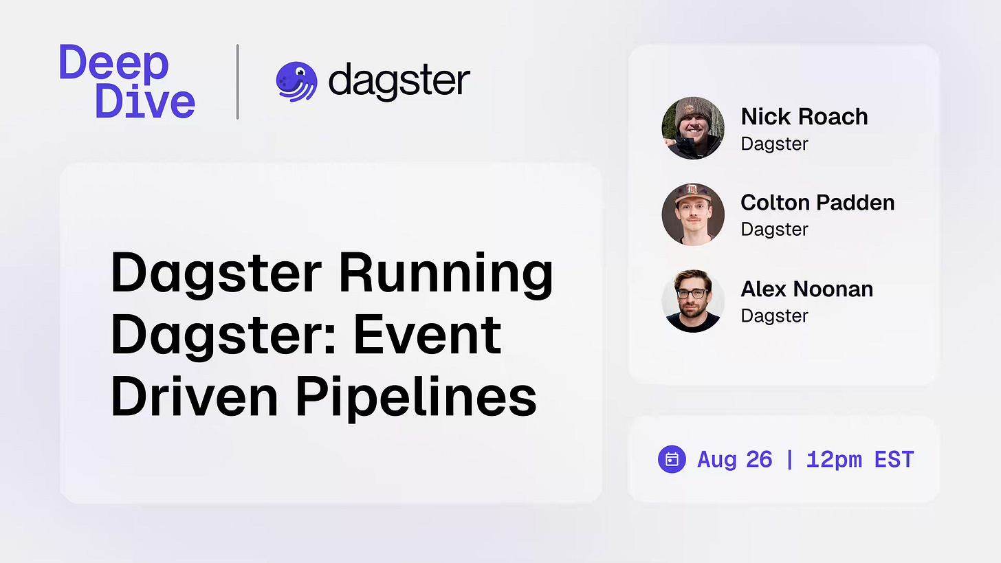 We had a huge response to our last Dagster Running Dagster session, and we’re bringing it back with a focus on event-driven pipelines and real-time observability. Dagster engineer Nick Roach (with Alex Noonan & Colton Padden) will walk through how we orchestrate millions of daily events with real-time observability using Dagster+.