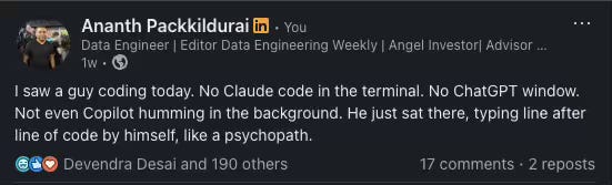 Is AI ready to be a real coder? Can it replace data engineering jobs? The manufacturing of code with the coding agents becomes much faster, which leads me to rephrase this famous Starbucks coffee analogy.