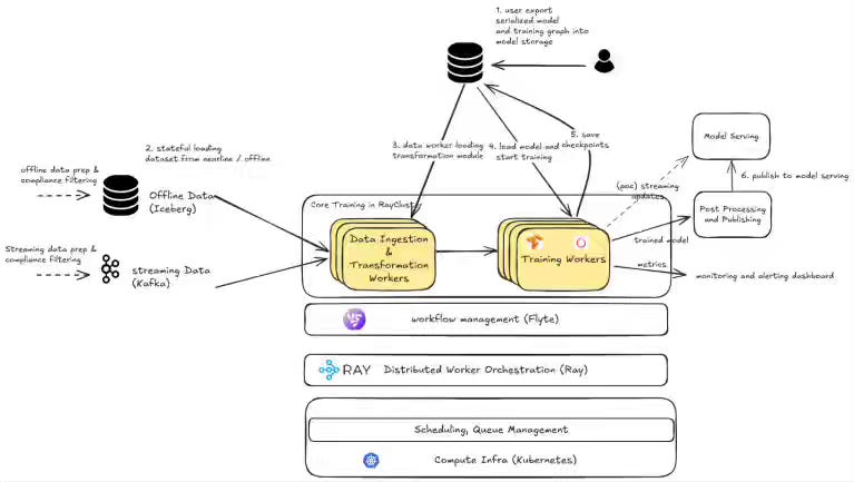 LinkedIn writes about building an incremental/online training platform—nearline feature attribution with Samza/Beam+Flink, Kafka-based streaming ingestion scaled via Ray, static training graphs for TF/PyTorch on Kubernetes orchestrated by Flyte/OpenConnect—to retrain from recent events continuously. The system cuts training cost (up to ~8.9× in benchmarks), boosts freshness to hourly/minute cadences, and drives measurable lifts (>2% Feed interactions, >2% qualified job applications, >4% ads CTR).