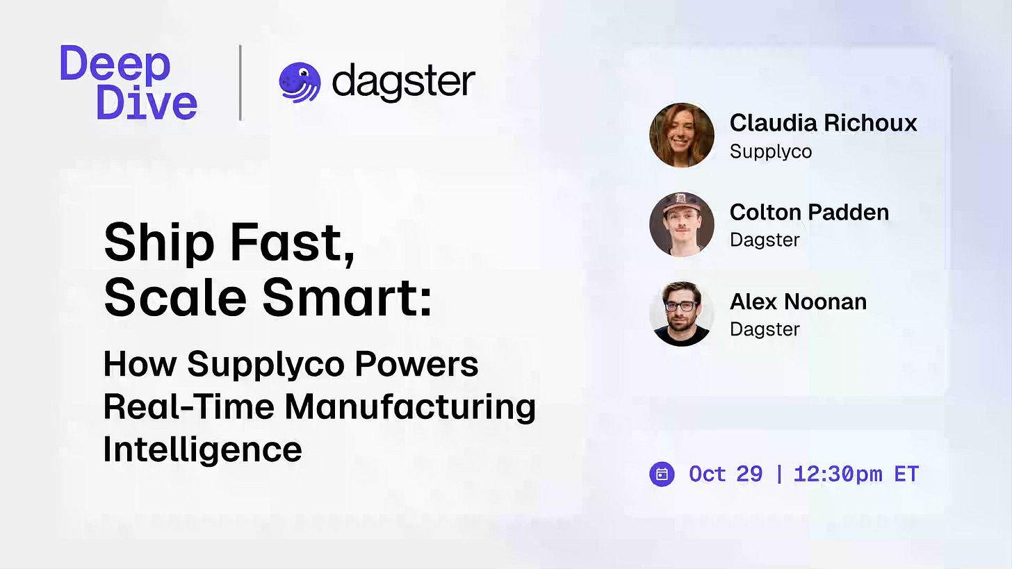 In our 10/29 deep dive, Supplyco’s CTO Claudia Richoux will reveal how they built a pipeline in Dagster that processes 100,000+ data streams in real time — while ensuring 99.99% uptime.