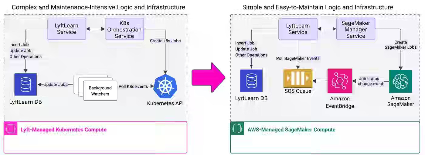 Lyft writes about the challenge of scaling its Kubernetes-only LyftLearn ML platform as operational complexity, state management overhead, and cluster-level capacity tuning become bottlenecks for thousands of daily training jobs and notebooks. The article details a hybrid LyftLearn 2.0 architecture that keeps low-latency online serving on Kubernetes while moving offline compute to AWS SageMaker, enabled by cross-platform base images, a SageMaker manager service, and SQS/EventBridge–based state tracking.