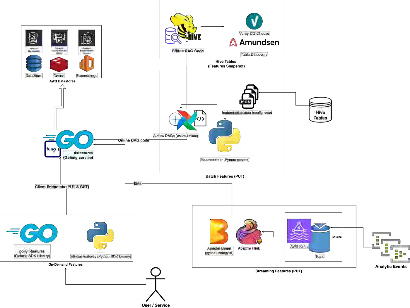 Lyft writes about a centralized Feature Store that maintains consistency between offline training and online inference across batch, streaming, and real-time serving. Batch features run on Spark SQL with auto-generated Airflow DAGs and Hive storage, streaming features use Apache Flink with Kafka and Kinesis, and online serving relies on DynamoDB with a ValKey write-through cache for low-latency access.