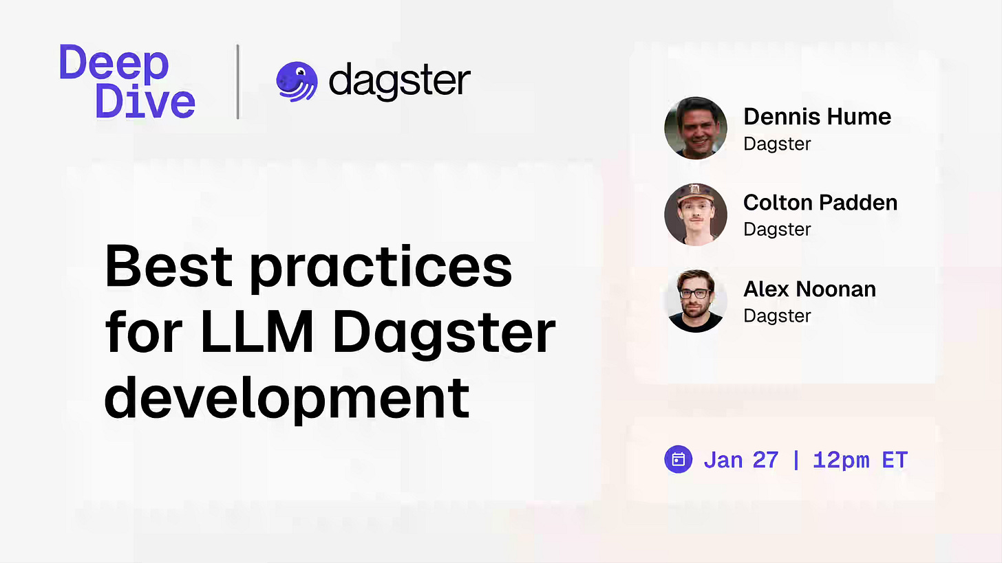 Join Dagster on Tuesday, January 27th, for a practical look at data engineering best practices, common pitfalls, and live demos of LLM developments.