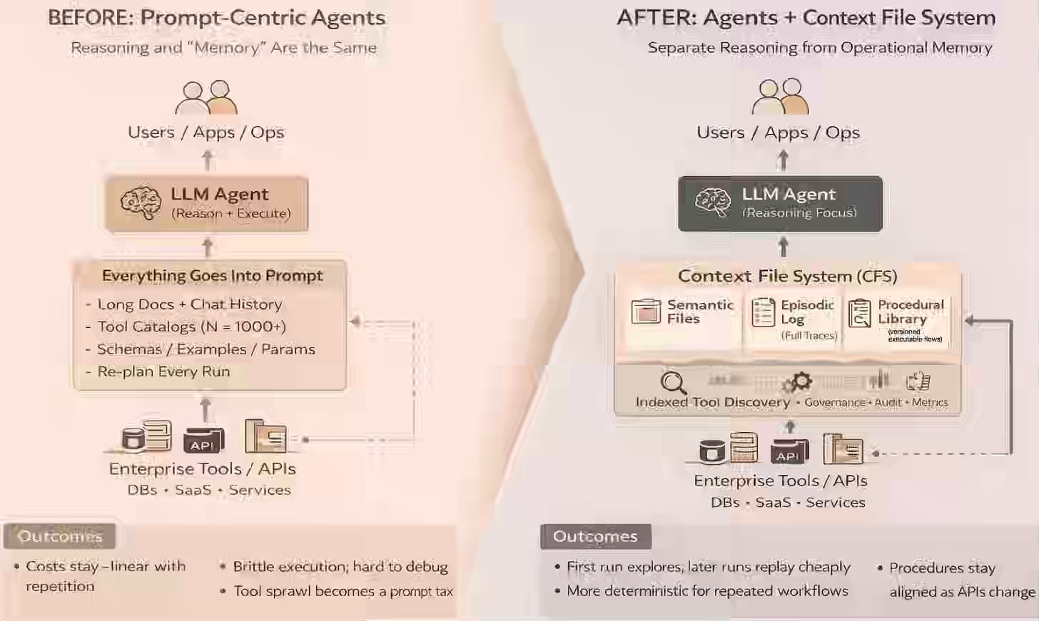 AI agents struggle to scale in operational environments because they rely on large, transient context windows that reset after each task and incur repeated planning costs. The article discusses a Context File System (CFS) that separates reasoning from persistent procedural memory, enabling agents to mount task-specific runbooks, reuse indexed tools, and replay proven workflows.