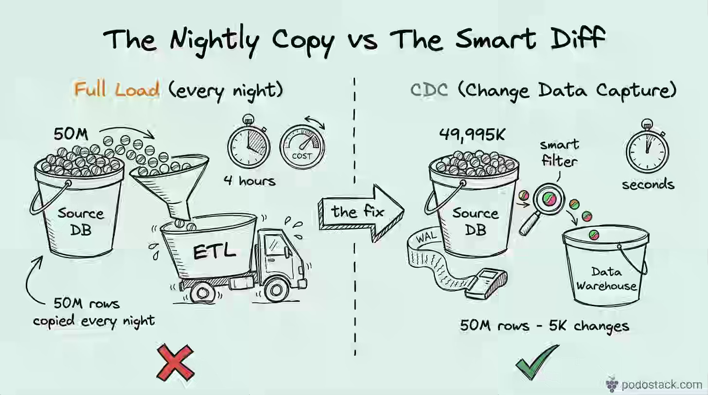 Nightly full-table copies introduce fragility and place increasing load on source databases as data volumes scale. The article contrasts timestamp, trigger, and log-based CDC approaches, recommending Debezium with Postgres WAL or MySQL binlog as the production standard for near-real-time replication without impacting OLTP performance. Log-based CDC captures hard deletes, handles DDL changes, and decouples replication throughput from transactional write load.