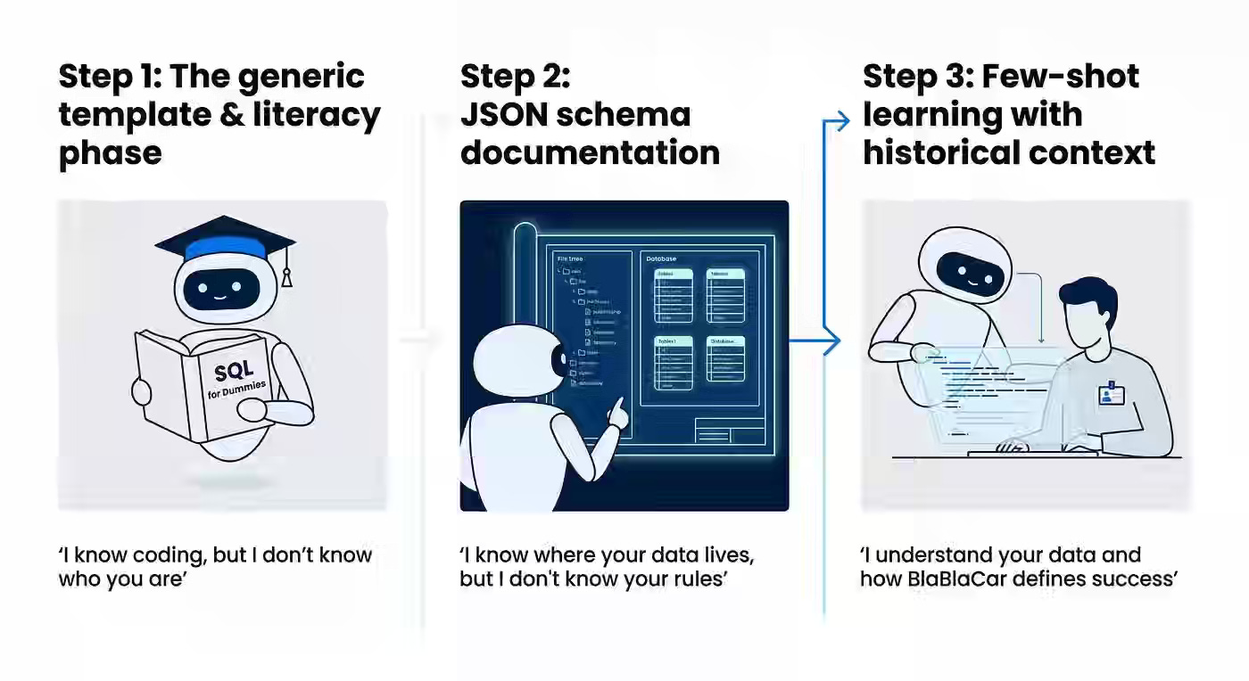 Data analyst bottlenecks in fast-moving organizations require enabling non-technical users to self-serve without compromising data integrity or introducing hallucinations. BlaBlaCar evolves its approach from generic LLM usage to structured JSON schema documentation and few-shot learning on expert query histories, teaching the system to map natural language to business rules. A three-zone autonomy framework—safe, risky, and dead zones—combined with SQL literacy training for PMs reduces error rates from 32% to 15% and shifts analysts from reactive ticket handling to strategic work.