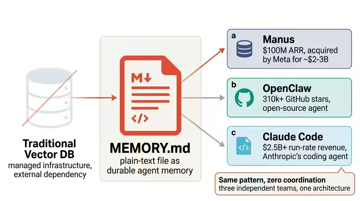 Agentic workflows expose the cost and operational overhead of managed vector databases when used for single-threaded memory and state management. The author shows how Manus, OpenClaw, and Claude Code converge on Markdown files as the primary memory layer, leveraging KV-cache efficiency, filesystem hierarchy for scoped retrieval, and sqlite-vec for lightweight semantic search. This file-first architecture reduces token costs by nearly 10x and defers vector database adoption to scenarios that require multi-user concurrency.