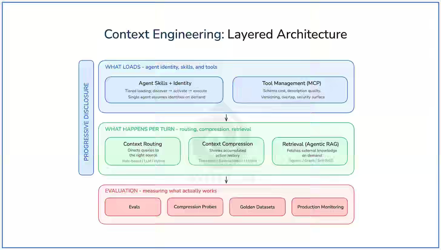 LLM reasoning degrades with oversized context, forcing developers to manage attention through structured context engineering rather than scaling model size. The author outlines five patterns—progressive disclosure, compression, routing, agentic RAG, and tool management—that control how context is selected and applied. Layered orchestration across discovery, activation, and execution enables complex agent behavior within fixed context limits while preserving reasoning quality.