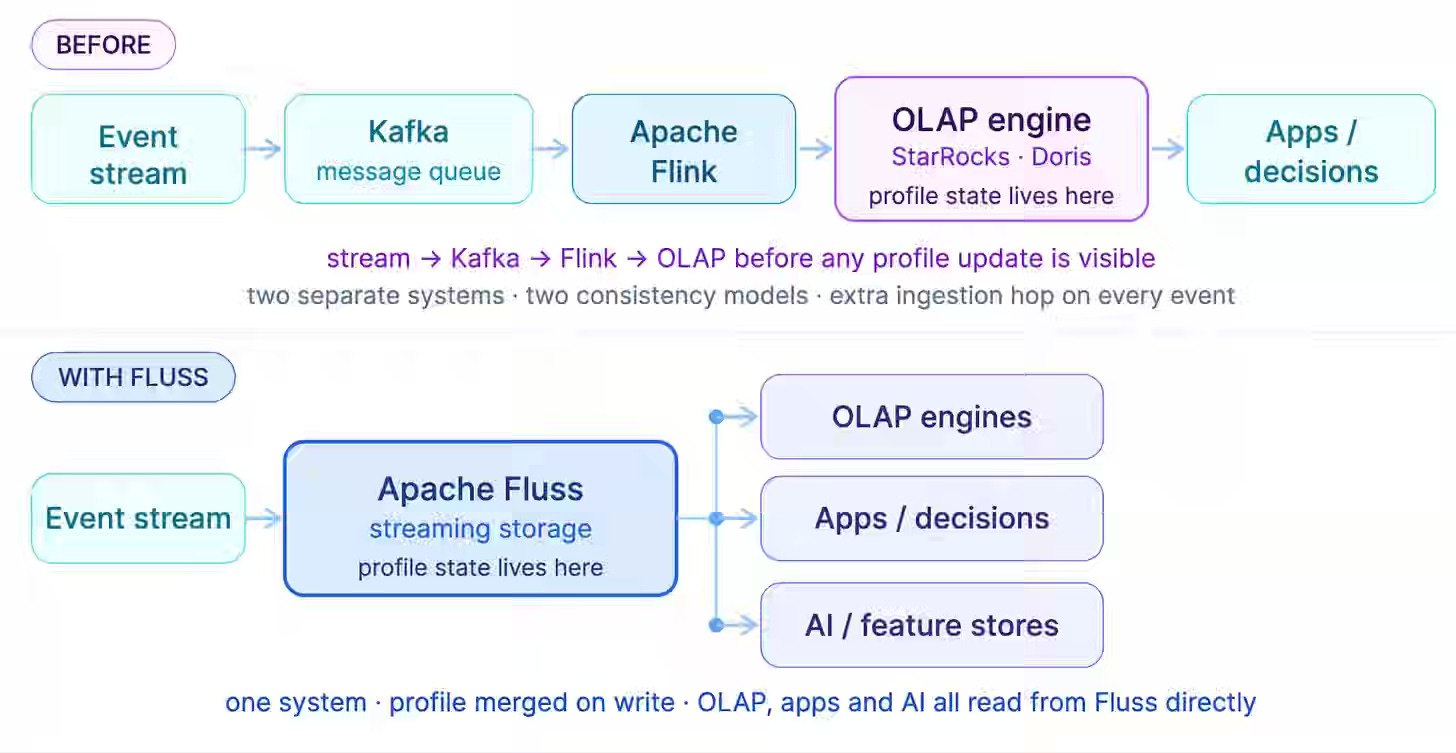 Real-time entity decisions fail when profile state lives in a separate OLAP layer, introducing ingestion lag between event arrival and visibility. The approach builds risk profiles directly in Apache Fluss by mapping identifiers to integers, encoding group membership as Roaring Bitmaps, and merging updates at write time using the Aggregation Merge Engine without stateful Flink jobs. This design removes the need for a separate profile store, reduces state latency from hours to seconds, and ensures correct recovery through replay-safe inverse operations in the UndoRecoveryOperator.