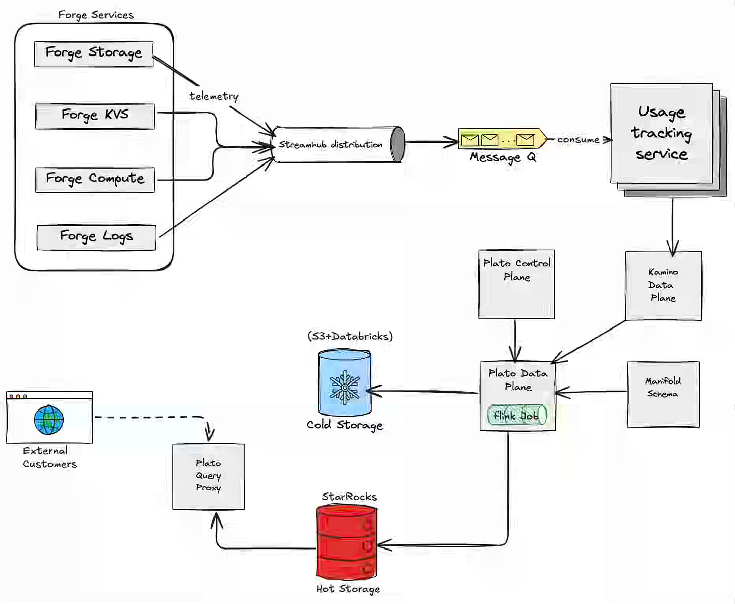 The billing pipeline, especially the usage-based billing pipeline, is often very complex, given the system's sensitivity to correctness. Atlassian describes Forge Billing as a deterministic pipeline—routing 300M daily usage events through StreamHub and UTS for deduplication and schema validation, then splitting them into cold-tier raw storage and StarRocks hot-tier aggregations for fast developer queries. The architecture handles counter and gauge metrics through idempotency keys and last-write-wins windowing, enabling full charge traceability from Developer Console back to raw events while scaling to 1B daily events within a year.