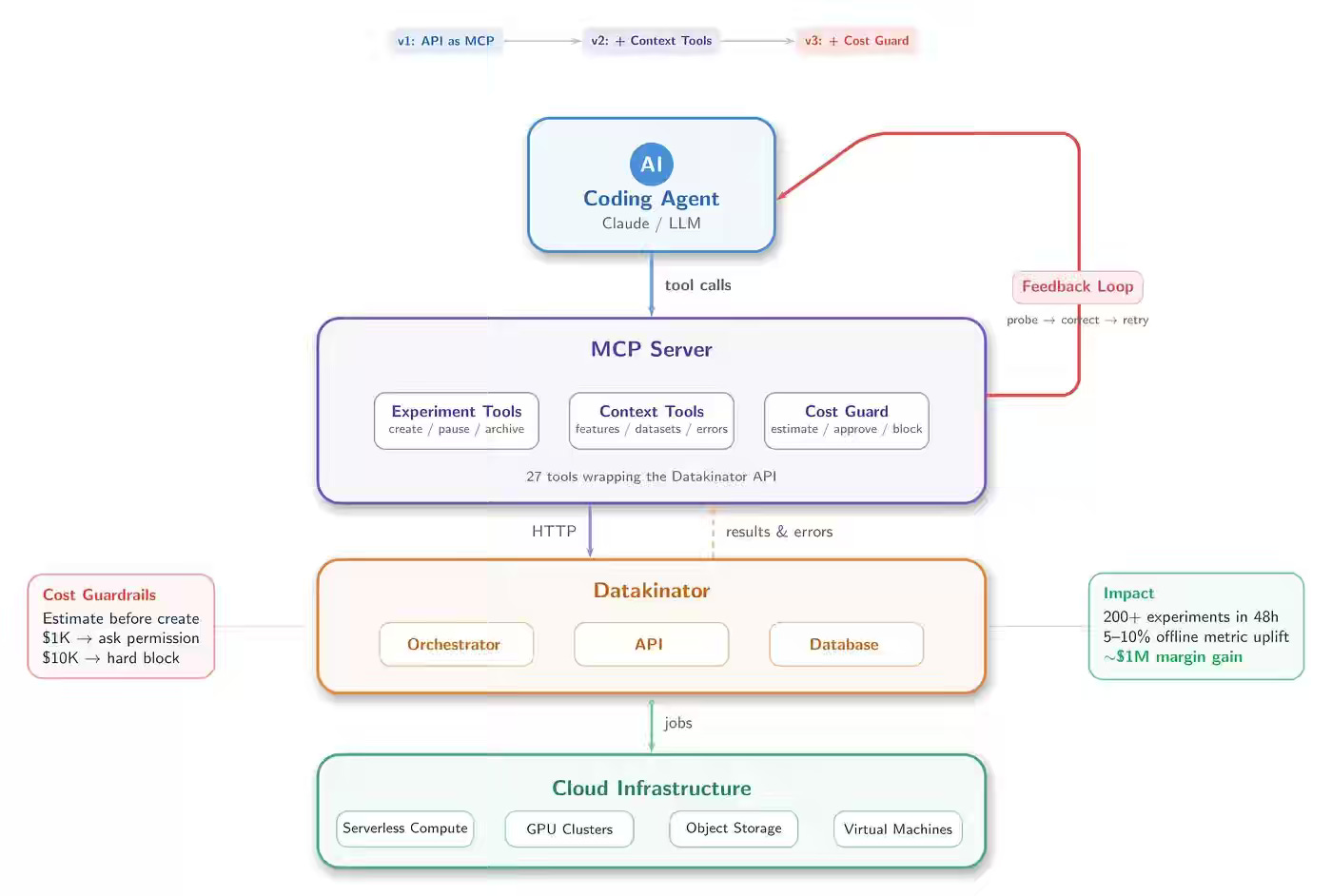 Teads writes about extending its Datakinator platform with agentic orchestration by exposing APIs through MCP, enriching them with dataset probing and error-retrieval tools, and adding cost guardrails that estimate and gate expensive runs. This approach scales experiment throughput from hundreds to thousands, enables autonomous retry and correction of failed runs, and delivers 5–10% model improvements that translate to nearly $1M in margin gains despite increased cloud usage.